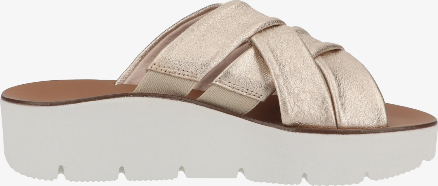 EffenLeerSleehakMet plateauOpen toeGevoerdProfielzolenLichte EVA-zoolElastische insertsFlexibele zoolMetallic lookGlad leerSlip